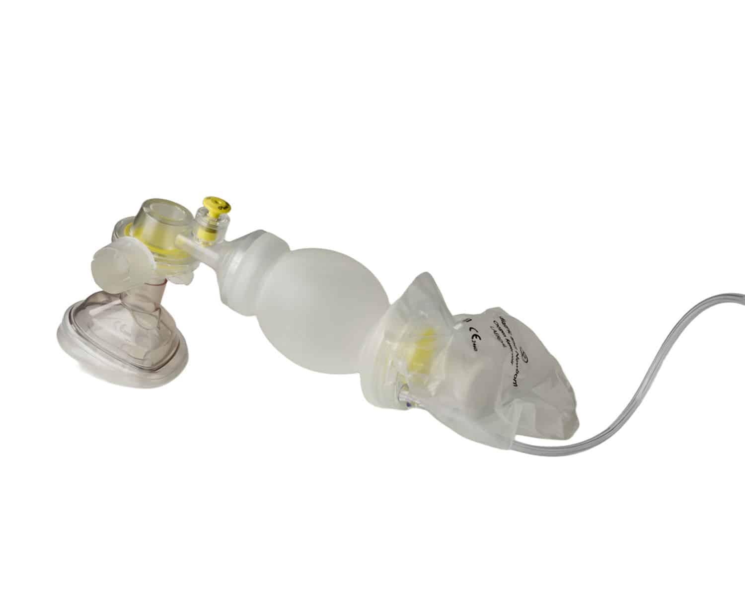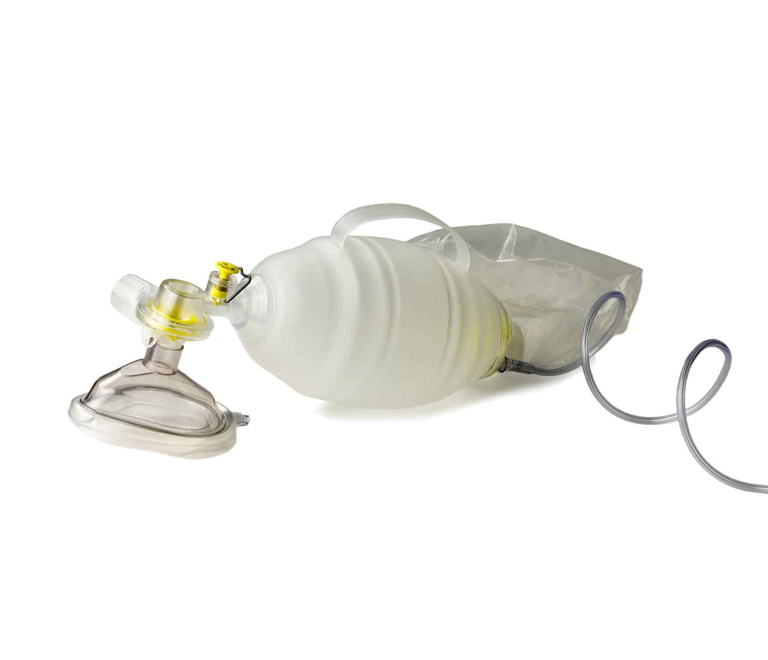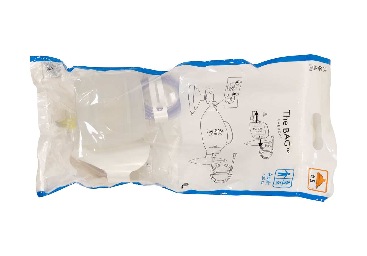 Laerdal BAG II aikuisten kertakäyttöinen elvytyspalje numero 5 maskilla, happiletkulla ja hapenvaraajapussilla.